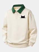 Relax Fit Black Cat Print Contrast Polo Sweatshirt