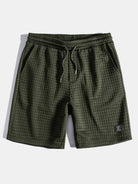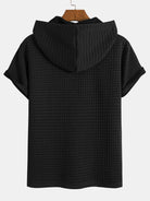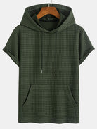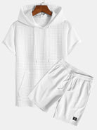 This casual suit features a hooded pocket T-shirt with a unique checkered texture. The hood adds a casual feel, and the drawstring detail is adjustable. The short-sleeved style is suitable for warm weather, and the chest pocket is practical and decorative. Paired with shorts in the same color, the elastic waistband with a drawstring makes it comfortable to wear. The overall style is casual and versatile, suitable for daily outings or leisure at home.