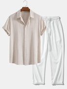 Linen Rayon Blend Button Up Shirt & Wrinkle Textured Straight Leg Pants
