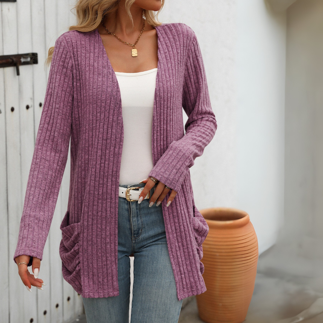 This cardigan combines a relaxed fit with soft, ribbed fabric, perfect for cooler days or layering over your favorite tops. With a range of stylish colors to choose from, it adds a touch of comfort and sophistication to your everyday style.
